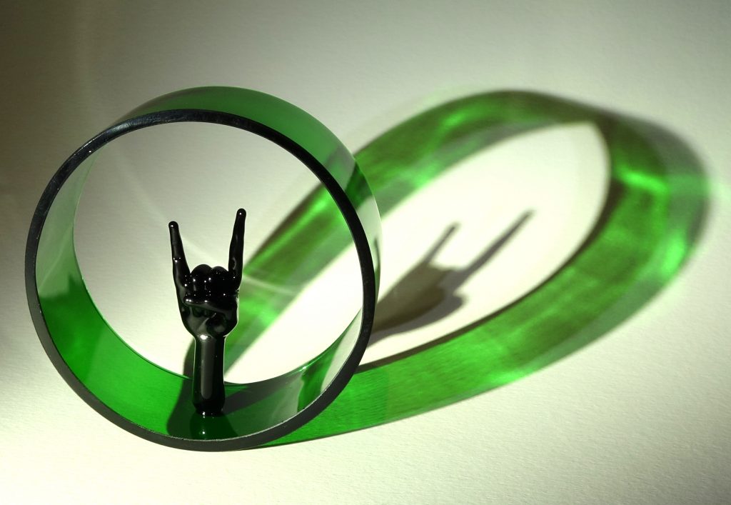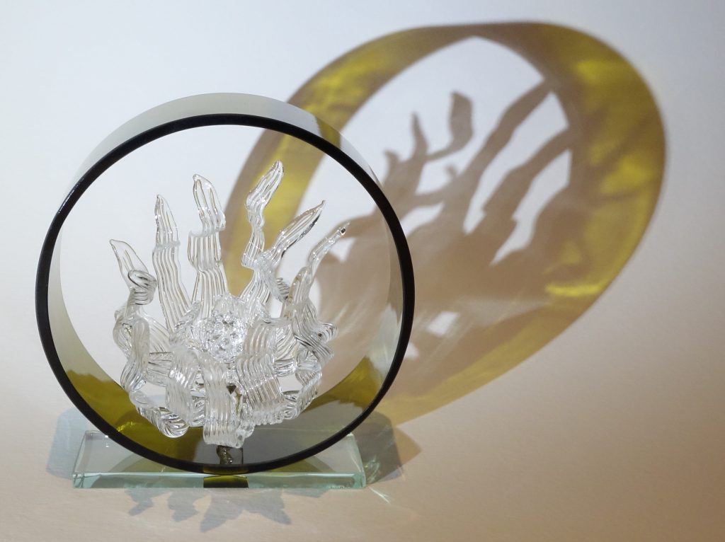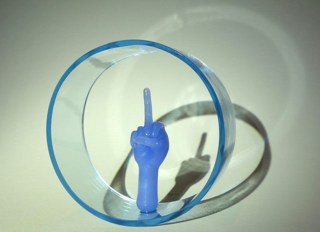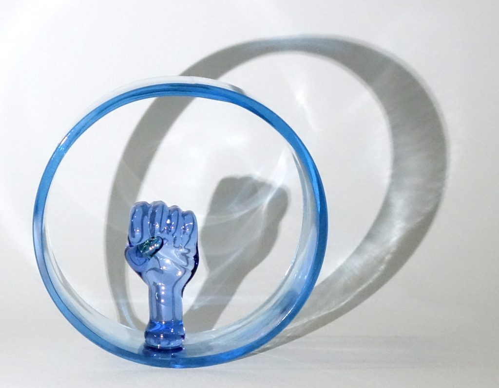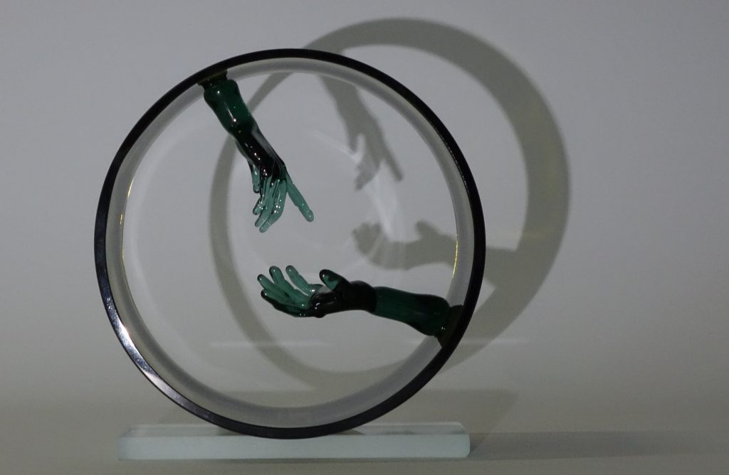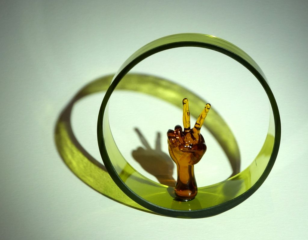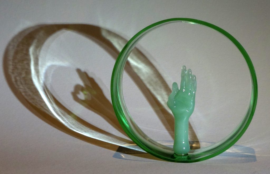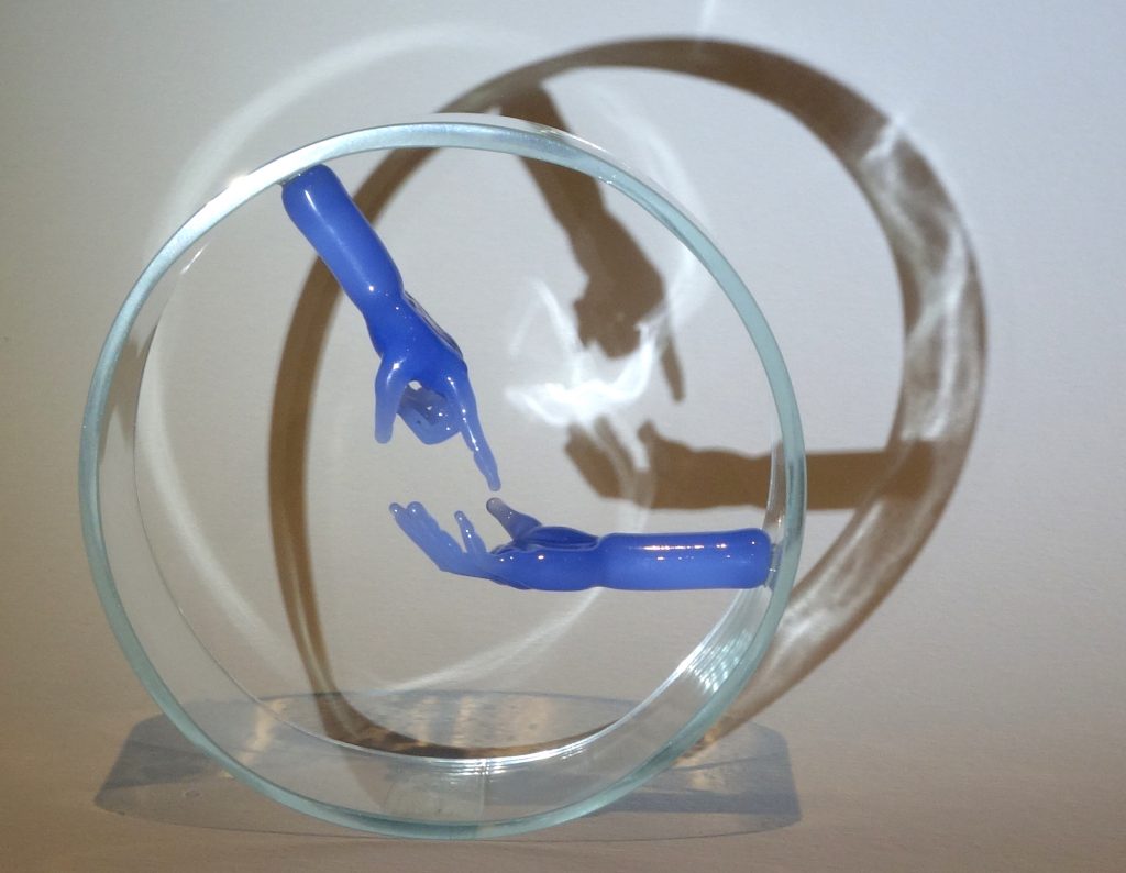 In Ringen aus Altglasflaschen zeigen Hände ihre vielfältigen Seite. Gesten die zu Frieden aufrufen und solche die eine Revolution verlangen, eine stumme Bitte aussprechen oder sich die Hand reichen. Die aus Altglasflaschen gesägten Ringe werden geschliffen und Poliert und entweder zum Aufhängen so belassen oder mit einem Standfuß aus recyceltem Fensterglas versehen. Die Hände werden vor einem Brenner in der Flamme heißgeformt und skulpturiert.